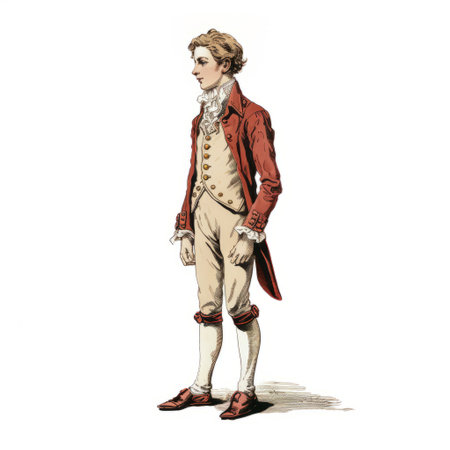a man in red clothing, adorned with a blue shirt and tie, is depicted in the style of a historical illustration. the costume design showcases a combination of dark crimson and light beige colors, reminiscent of the 18th century. the image has been digitally enhanced, highlighting the elaborate costumes worn by the youthful protagonists. ai generated