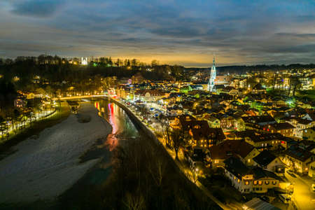Night City Bad Toelz Aerial HDR. Long Exposure. Isar River Kalvarienberg Churches. Bavaria Germany Europe