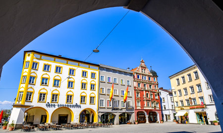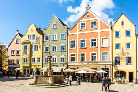 Rosenheim, Germany - April 11: typical historic bavarian buildings at the old town of Rosenheim on April 11, 2020