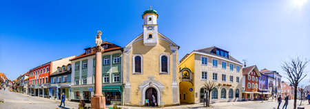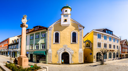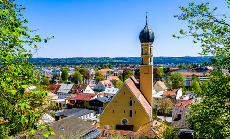 Wolfratshausen, Germany - April 23: famous bavarian old town with church and historic buildings of Wolfratshausen on April 23, 2020