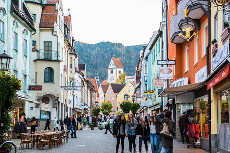Fussen, Germany - June 4, 2016: View of pedestrian historical street in Fussen with typical bavarian architecture buildings.