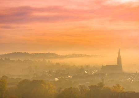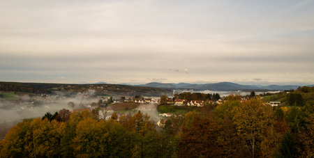 Small town village during the sunrise with fog. surrounded by hills in lower austria. Aerial drone photo
