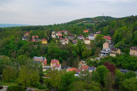 Typical colorful czech houses in Loket, a picturesque town in Czech Republic, with the green trees of the mountain at the background