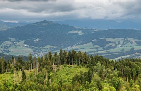 Picturesque view from the top of the mountain landscape, forests, pastures, meadows and small villages with a cloudy sky covering the Alps. Haute-Savoie, region of Auvergne-Rhone-Alpes in France.