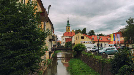 Samobor, Croatia-August 13th, 2019: Storm clouds gathering over small tourist town of Samobor, and Gradna stream going through the center along old houses