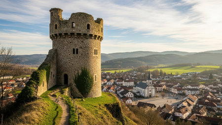 Historic stone tower overlooking scenic european village with church and rolling hills.