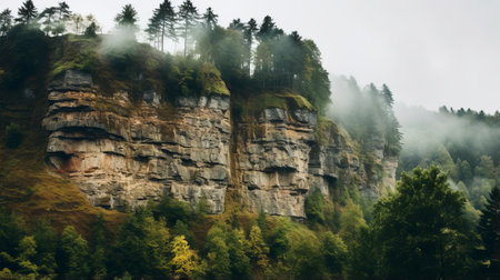 a breathtaking landscape captured by a nikon d850 camera, showcasing a dense forest and majestic cliffs enveloped in a mystical fog. this uhd image, reminiscent of national geographic's naturalistic portraiture, exudes a free-flowing surrealism. the scene's primitivist realism and nature-inspired installations create a captivating and immersive experience. ai generated
