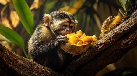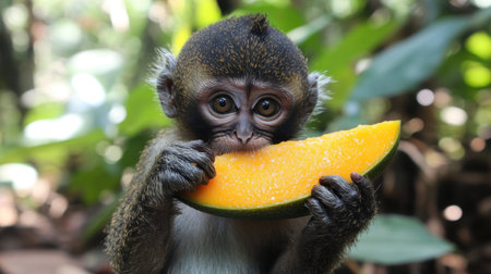 A charming young monkey holds a slice of cantaloupe, illustrating its playful curiosity amidst a lush rainforest backdrop, representing wildlife wonder.