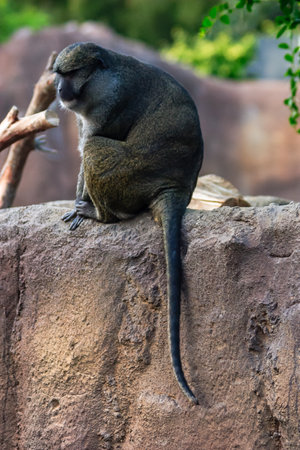 An inquisitive but suspicious Wolf's Mona Monkey observing its surroundings