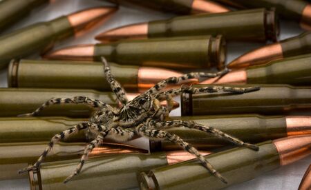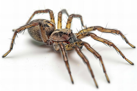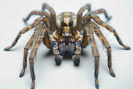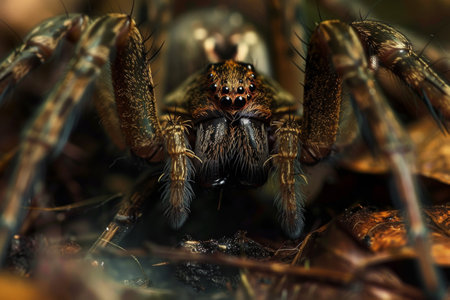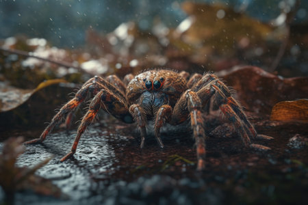 This captivating close-up image showcases a spider in its natural habitat, emphasizing its intricate details and striking textures under soft lighting. The photo highlights the unique features of this arachnid, making it ideal for educational and artistic projects.