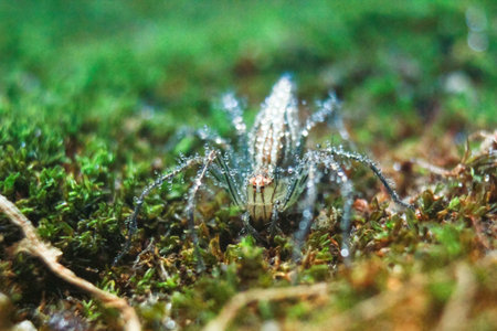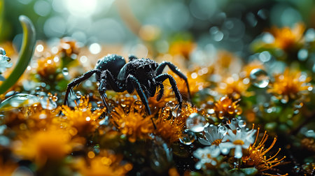 AI Generated. Large Spider in Dark Burrow with Dew Drops