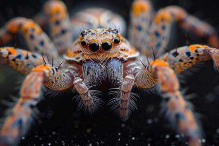 This captivating close-up image showcases a spider, focusing on its intricate details and captivating textures against a dark background, revealing its beauty.