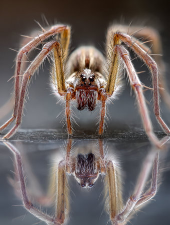 This macro image captures a brown spider in stunning detail, highlighting its intricate features and reflection on a dark surface. Perfect for nature enthusiasts.