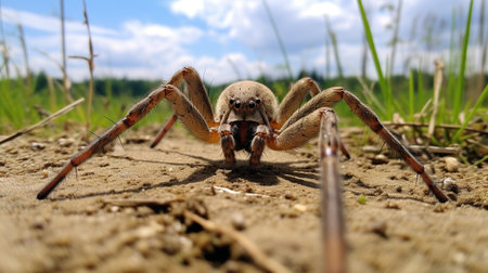 A close-up view of a spider crawling on the ground, showing its intricate body features and movements. The spider appears to be exploring its surroundings in its natural habitat.