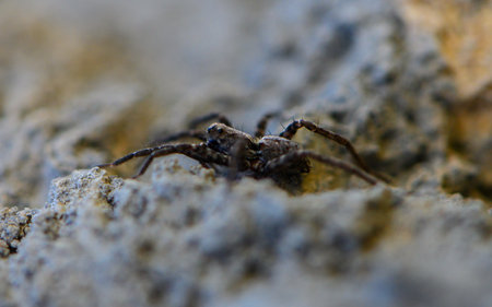 A spider carefully traverses a rough rocky terrain under soft, natural illumination, showing its intricate details.