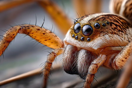 Detailed macro image of a spider focusing on its eyes and legs with a soft blurred backdrop. Generative AI