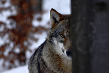 Wolf looking at the camera through snowy bush in Ranua, Lapland