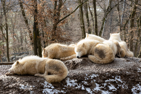 A pack of wild wolves are sleeping in the sun. One Wolf in the foreground.