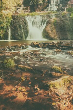 Beautiful mountain rainforest waterfall with fast flowing water and rocks, long exposure. Natural seasonal travel outdoor background in hipster vintage style