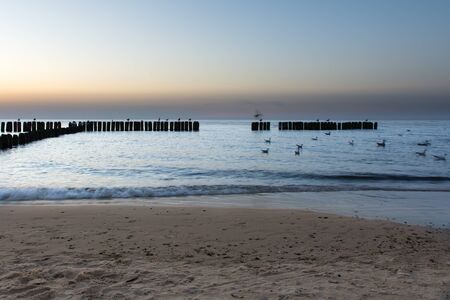 Sunset on an empty beach with wooden breakwaters. Dziwnowek, Baltic sea, Poland.