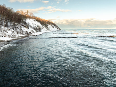 Winter Sea Landscape With Snowy Beach and Icy Waves Along a Quiet Shoreline at Dusk.