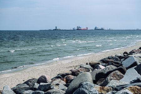 Rocky shoreline with waves rolling onto sandy beach and distant view of industrial ships and control tower. Coastal scene. Gdansk, Poland - May 19, 2024