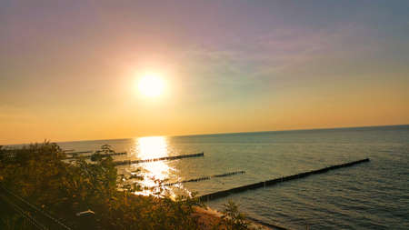 Setting sun seen from the beach in Darłówko, Poland. Beautiful seascape. Wooden breakwater on the horizon. Blur effect (long exposure)