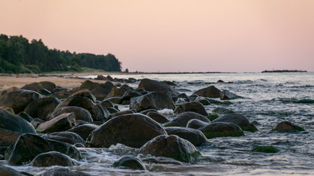 Beautiful rocky sea shore at sunrise or sunset. Long exposure landscape. Baltic sea near Gdynia in Poland.