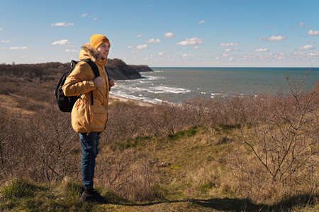 A man in a yellow jacket and hat with a large backpack on the side of the mountain looks into the distance to the sea. Traveling in Europe, a world without borders.