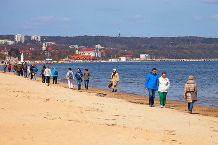 People walk at Sopot beach on a sunny spring day. Photo taken on: May 01st, 2013