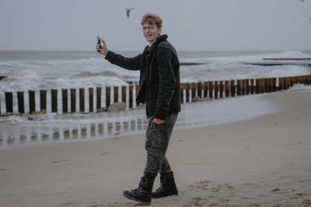 a young guy holds a smartphone in his hands, looks at the camera with a smile on his face, is dressed in black clothes, oxesuar round transparent glasses, walks along the beach, takes pictures of the curtain of the sea