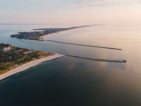 Aerial view of Pillau citadel in Baltiysk, Kaliningrad region, Russia and Baltic spit on Baltic sea at sunset. drone view. travel destination