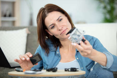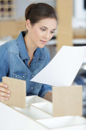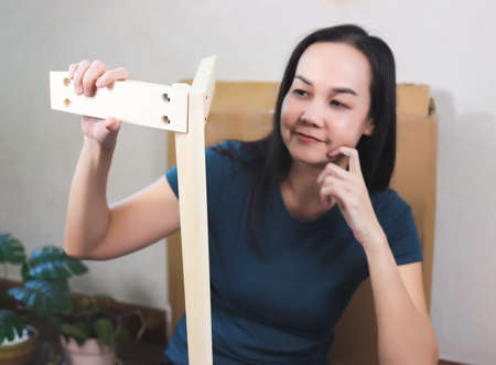 Asian woman try to assemble knock down furniture and getting confused. Selective focus on furniture.