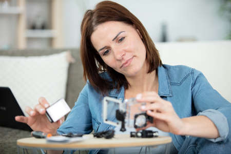 Attractive young Caucasian woman adjusting panels of LED light while preparing to shoot video in home studio