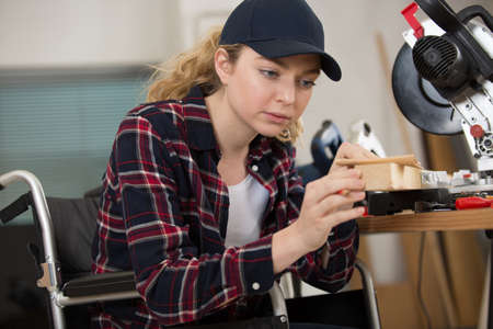 A female carpenter works in her workshop. A woman is engaged in woodworking. Craftswoman with a piercing. Work in a carpenter workshop.
