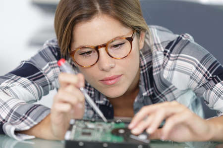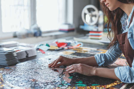 Close-up of female designer sitting in front of the table and working with professional pictures