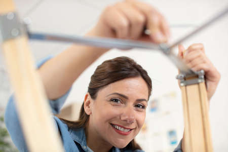 Portrait of Asian woman trying to assemble knockdown furniture, screwing the screw into wood and smiling.