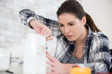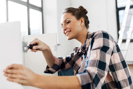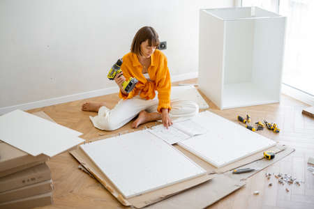 Young woman assembles furniture by herself while renovating her new apartment. DIY and house improvement concept