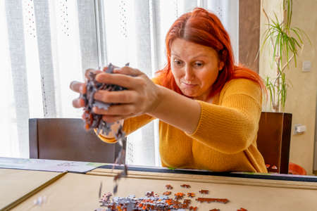 Beautiful redhead woman in a yellow sweater doing a puzzle in the living room at home. Entertainment concept