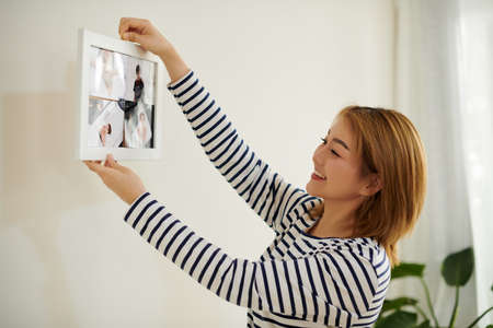 Happy young Asian woman hanging photograph in white frame on wall to decorate apartment