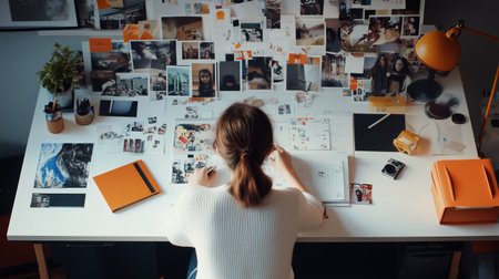 A woman organizes nature-themed photographs on a wall in her inviting workspace, inspiring creativity and planning.