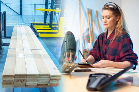 Designer furniture during work. Carpenter woman. Designer furniture works surrounded by wood parts. Woman in a plaid shirt. Lots of wooden balos at a furniture factory. Career designer.