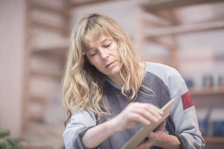 A female carpenter marks details with a pencil and cuts wood with a knife in a carpentry or homemade workshop.Workplace. Production of wooden toys.