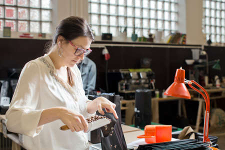 Lifestyle concept, work from home to reinvent your life - Jewelry designer workplace. Woman make jewelry. Georgian minankari enamel manufacturing technique. work with melting furnace for jewelers