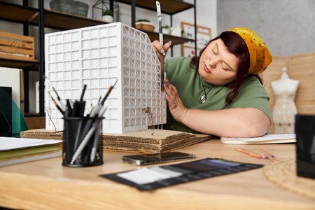 Fashion designer woman working on her designs in the studio, sitting at the desk.