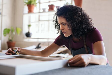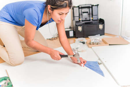 Latin Bolivian strong and independent success woman assembly and repair furniture with hammer.