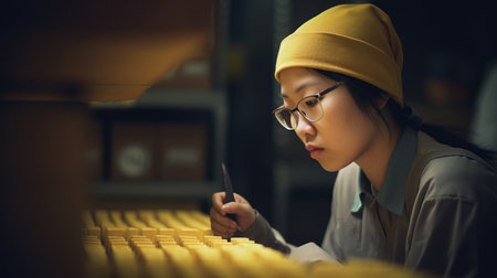 Factory Worker Female Asian Young Adult Packaging finished products for shipping in Packaging area. Generative AI AIG22.