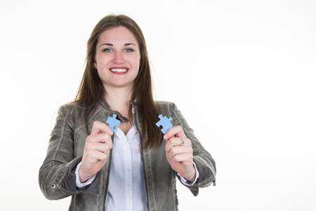 Business woman standing and trying to make whole picture from wooden details puzzle alone in office, selective focus. Leadership, successful management and strategy concept