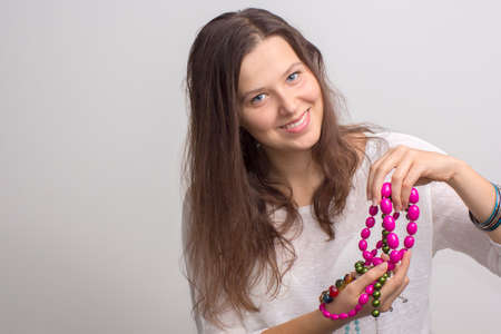 Young woman in white with plenty of jewellery and beads in hands bright background.