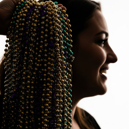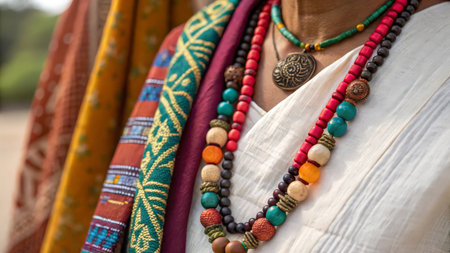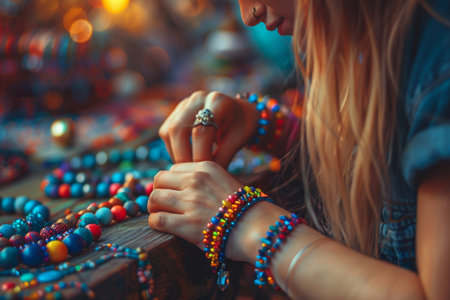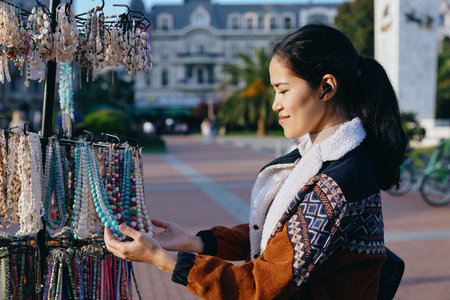 jewelry, necklaces, bracelets, accessories, shopping, street, market, vendor A shopper inspects beadwork at an outdoor stall, sunlight highlighting colorful beads and casual fashion in a vibrant plaza